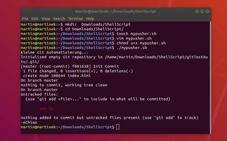 Fange wir an. Wir möchten ein Script erstellen, dass uns in einem Git Repository alle Änderungen verfolgt, commitet und in unser Remote Repository pusht.